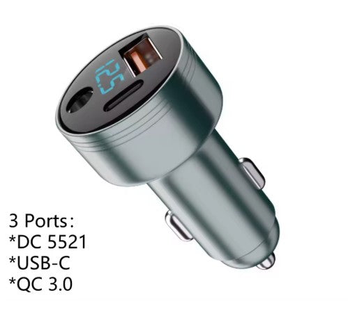 Cargador de coche digital, cargador de a bordo con DC 5521 USB-C QC 3.0, 3 puertos, admite carga rápida PD con cable DC 16AWG